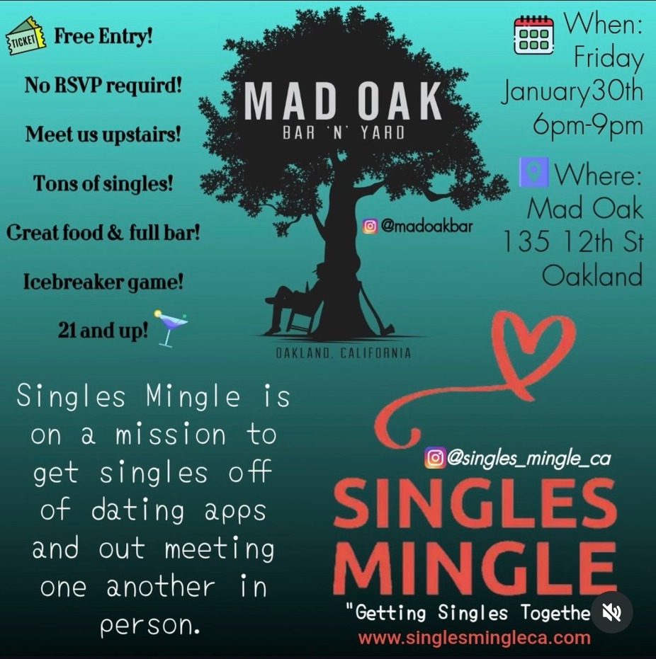 Singles Mingle CA is throwing a big, lively Singles Mingle party at Mad Oak in Oakland! We’ll have the entire upstairs balcony to ourselves — complete with heaters, a private bar, delicious food available to order, light background music, and of course, our signature icebreaker game. Free entry!